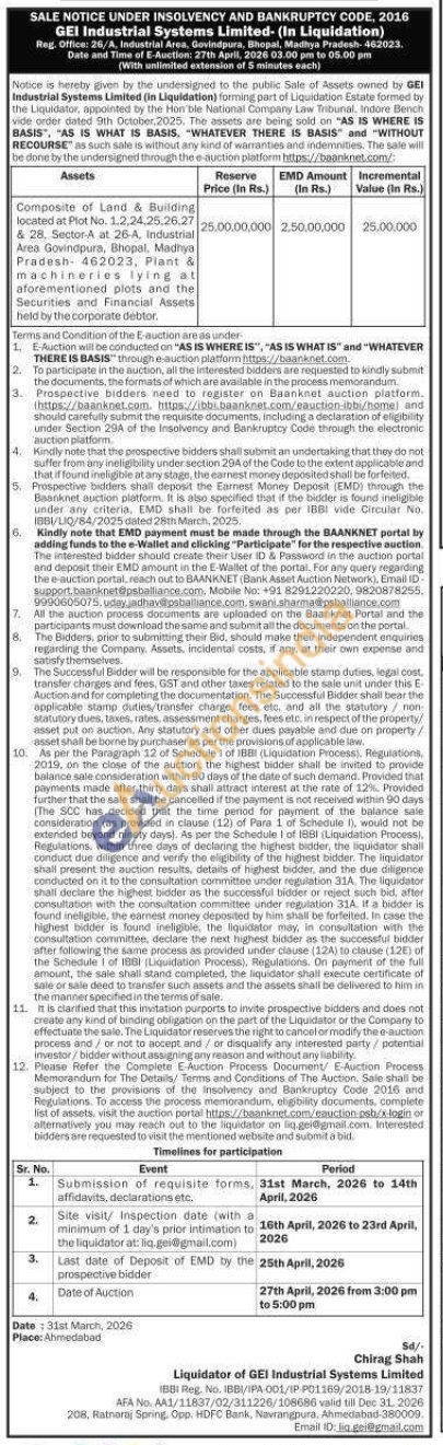 Composite of Land & Building located at Plot No. 1.2,24,25,26,27 & 28, Sector-A at 26-A, Industrial Area Govindpura, Bhopal, Madhya Pradesh-462023, Plant & machineries lying at aforementioned plots and the Securities and Financial Assets held by the corporate debtor