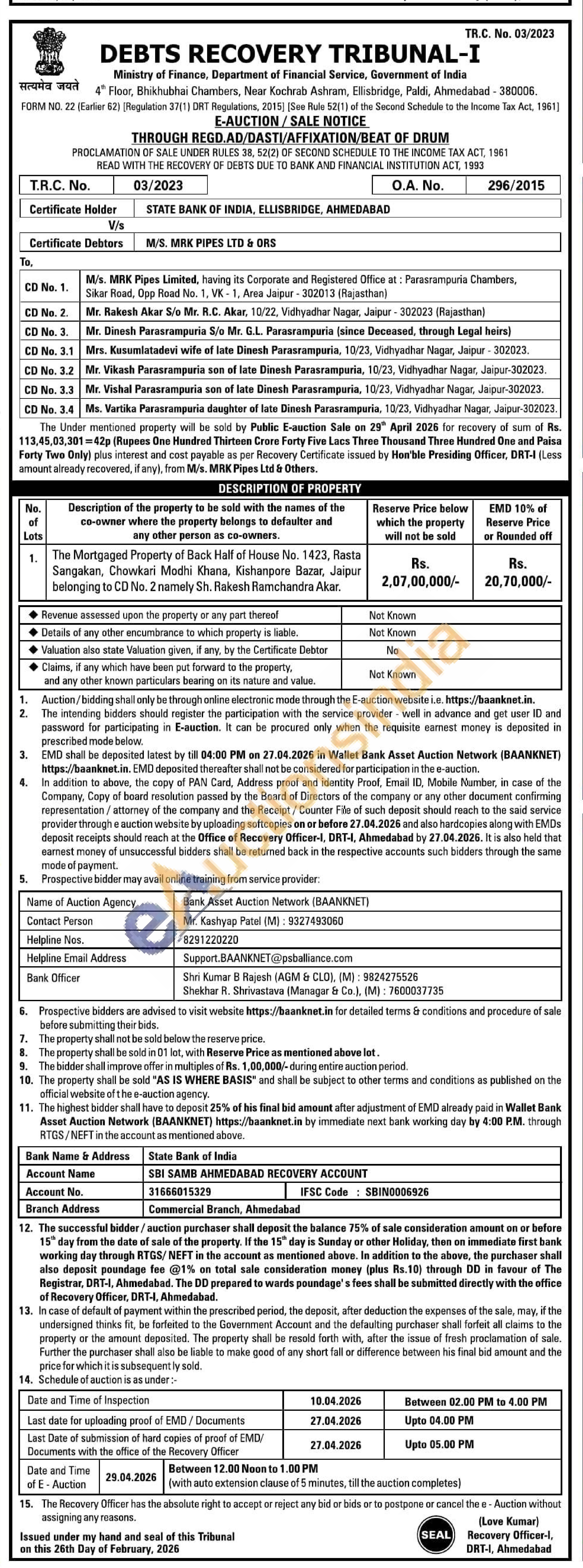 The Mortgaged Property of Back Half of House No. 1423. Rasta Sangakann, Chowkeri Modhi Khana, Kishanpore Bazar, Jaipur belonging to CD No. 2 namely St. Rakesh Ramchandra Aka