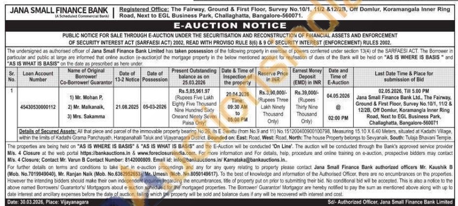 Details of Secured Assets: All that piece and parcel of the immovable property bearing No. 26, its E Swattu (from No.9 and 11) No. 151200400900100798, Measuring 15.10 X 6.40 Meters, situated at Kadathi Village, within the limits of Kadathi Grama Panchayath, Harapanahalli Taluk and Vijayanagara District. Bounded on: East: Road, West: Road, North: The house Property belongs to Sevyanaik, South: Tulaja Bhavani Temple