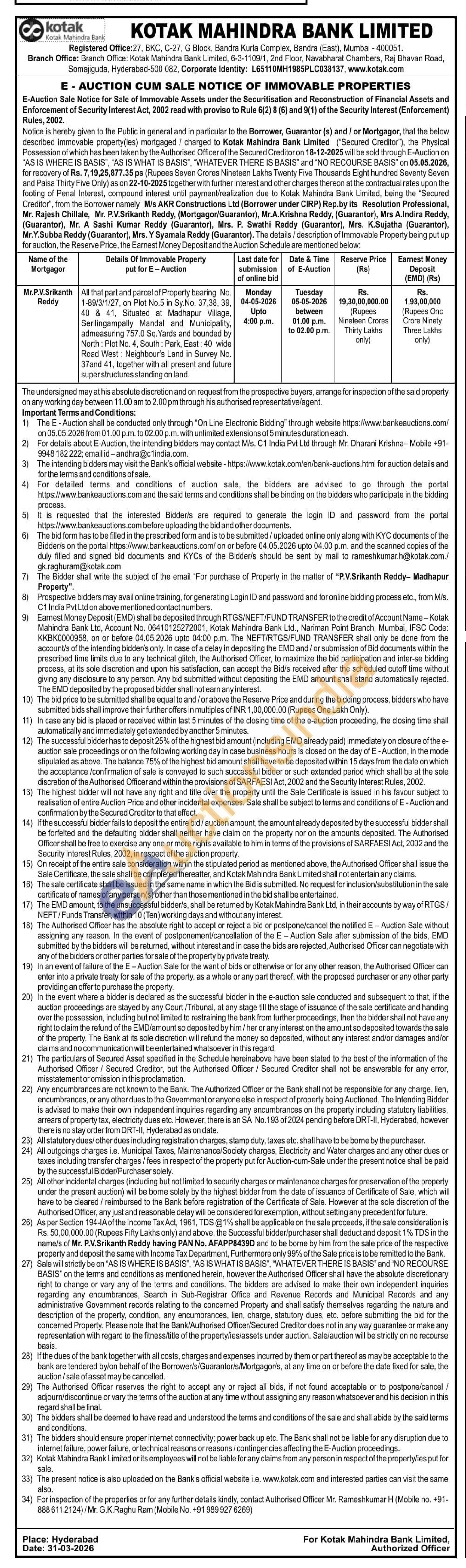 All that part and parcel of Property bearing No. 1-89/3/1/27, on Plot No.5 in Sy. No. 37,38, 39. 40 & 41, Situated at Madhapur Village. Serilingampally Mandal and Municipality admeasuring 757.0 Sq. Yards and bounded by North: Plot No. 4, South: Park, East: 40 wide Road West: Neighbour's Land in Survey No. 37and 41. together with all present and future super structures standing on land.