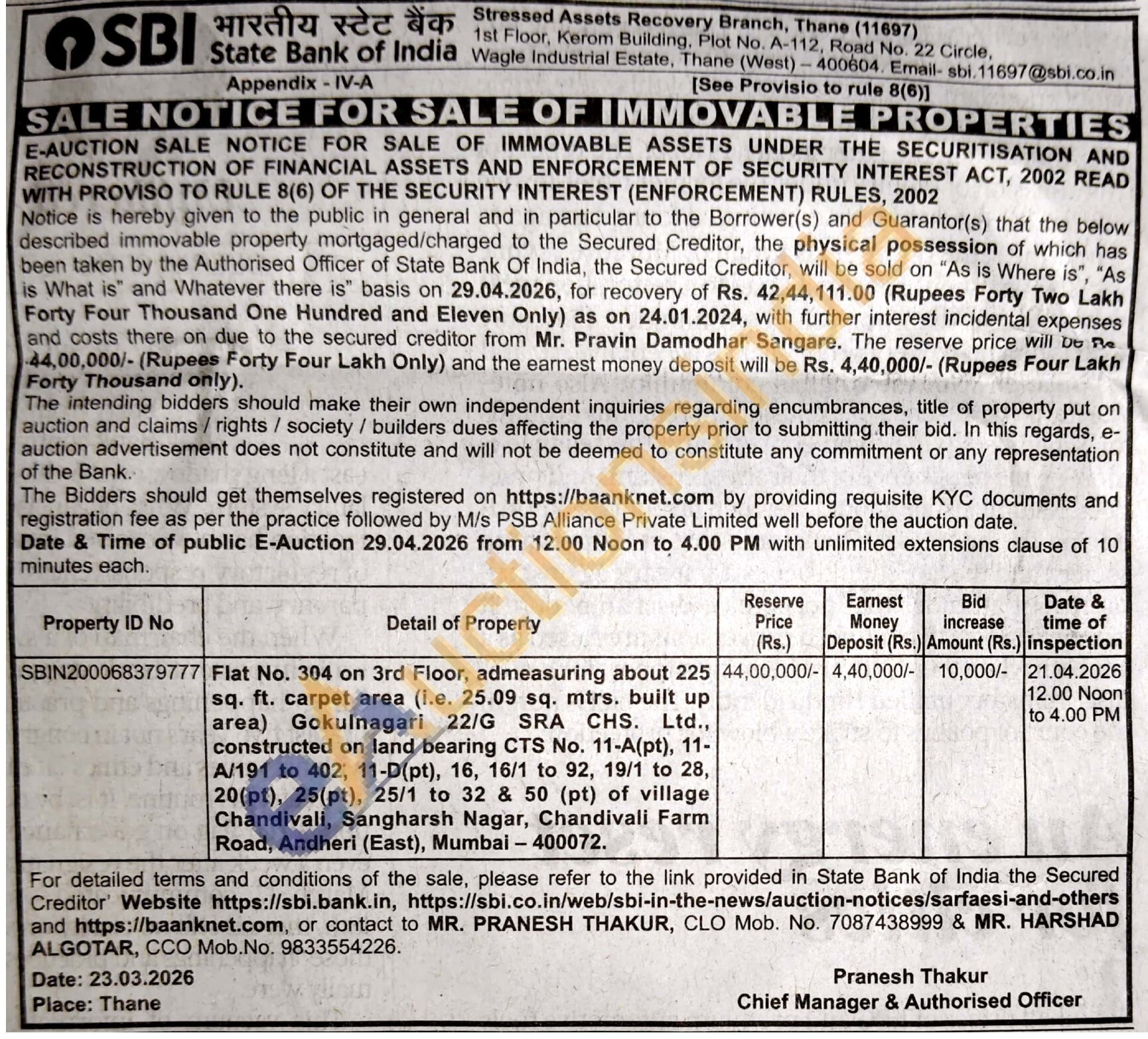Flat No. 304 on 3rd Floor, admeasuring about 225 sq. ft. carpet area (i.e. 25.09 sq. mtrs. built up area) Gokulnagari 22/G SRA CHS. Ltd., constructed on land bearing CTS No. 11-A(pt), 11-A/191 to 402, 11-D(pt), 16, 16/1 to 92, 19/1 to 28, 20(pt), 25(pt), 25/1 to 32 & 50 (pt) of village Chandivali, Sangharsh Nagar, Chandivali Farm Road, Andheri (East), Mumbai - 400072