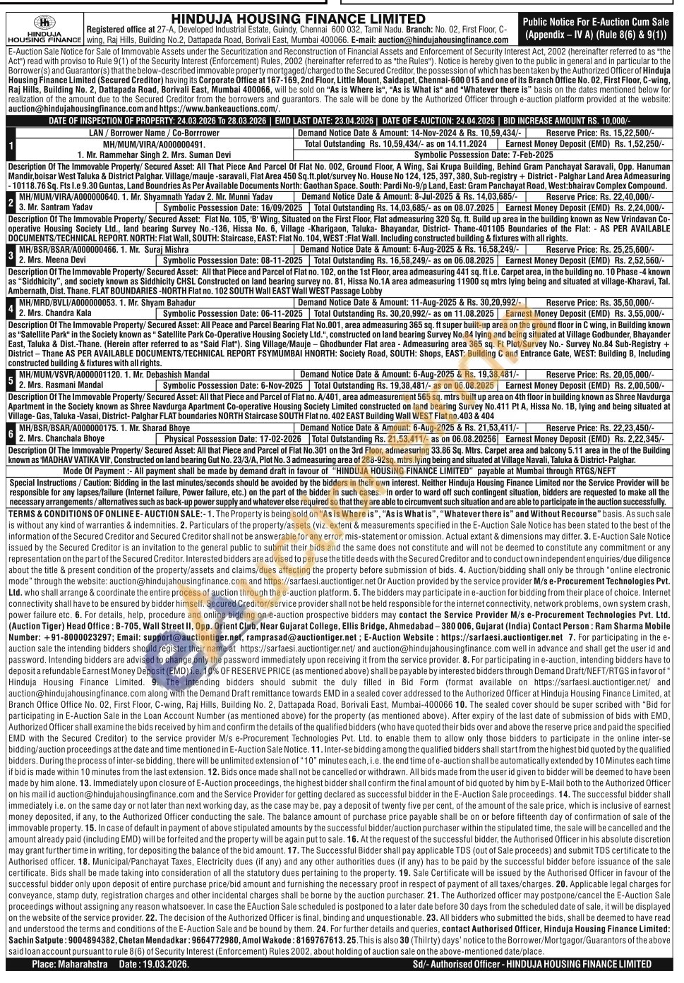 Description Of The Immovable Property/Secured Asset: All Peace and Parcel Bearing Flat No.001, area admeasuring 365 sq. ft super built-up area on the ground floor in C wing, in Building known as "Satellite Park" in the Society known as "Satellite Park Co-Operative Housing Society Ltd.", constructed on land bearing Survey No.84 lying and being situated at Village Godbunder, Bhayander East, Taluka & Dist.-Thane. (Herein after referred to as "Said Flat"). Sing Village/Mauje Ghodbunder Flat area - Admeasuring area 365 sq. Ft Plot/Survey No.- Survey No.84 Sub-Registry + District-Thane AS PER AVAILABLE DOCUMENTS/TECHNICAL REPORT FSYMUMBAI HNORTH: Society Road, SOUTH: Shops, EAST: Building C and Entrance Gate, WEST: Building B, Including