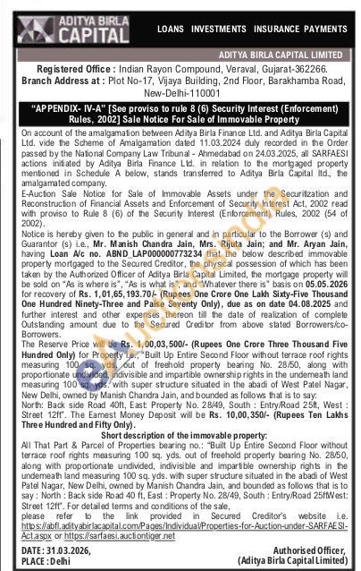 All That Part & Parcel of Properties bearing no.: "Built Up Entire Second Floor without terrace roof rights measuring 100 sq. yds. out of freehold property bearing No. 28/50, along with proportionate undivided, indivisible and impartible ownership rights in the underneath land measuring 100 sq. yds. with super structure situated in the abadi of West Patel Nagar, New Delhi, owned by Manish Chandra Jain, and bounded as follows that is to say: North: Back side Road 40 ft, East: Property No. 28/49, South: Entry/Road 25ffWest: Street 12ff. For detailed terms and conditions of the sale,