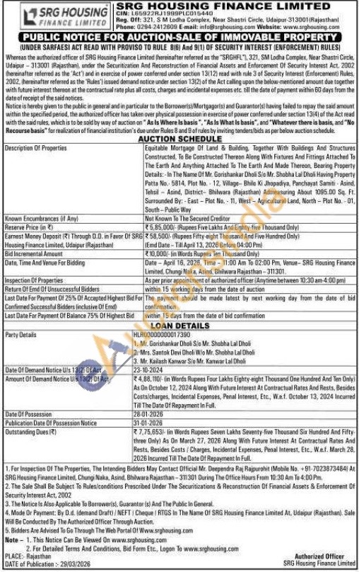 Equitable Mortgage Of Land & Building Together With Buildings And Structures Constructed, To Be Constructed Therson Along With Fixtures And Fittings Attached To The Earth And Anything Attached To The Earth And Made Thereon, Bearing Property Details: In The Name Of Mr. Gorishankar Dholi Sie Mr. Shobha Lal Dholi Having Property Patta No. 5814, Plot No. 12, Village Bhilo Ki Jhopadrya, Panchayat Samiti Asind, Tehsil Asind, District-Bhilwara (Rajasthan) Admeasuring About 1095.00 Sq. Ft. Surrounded By: East-Plot No. 11. West-Agricultural Land, North-Plot No. 01. South-Public Way