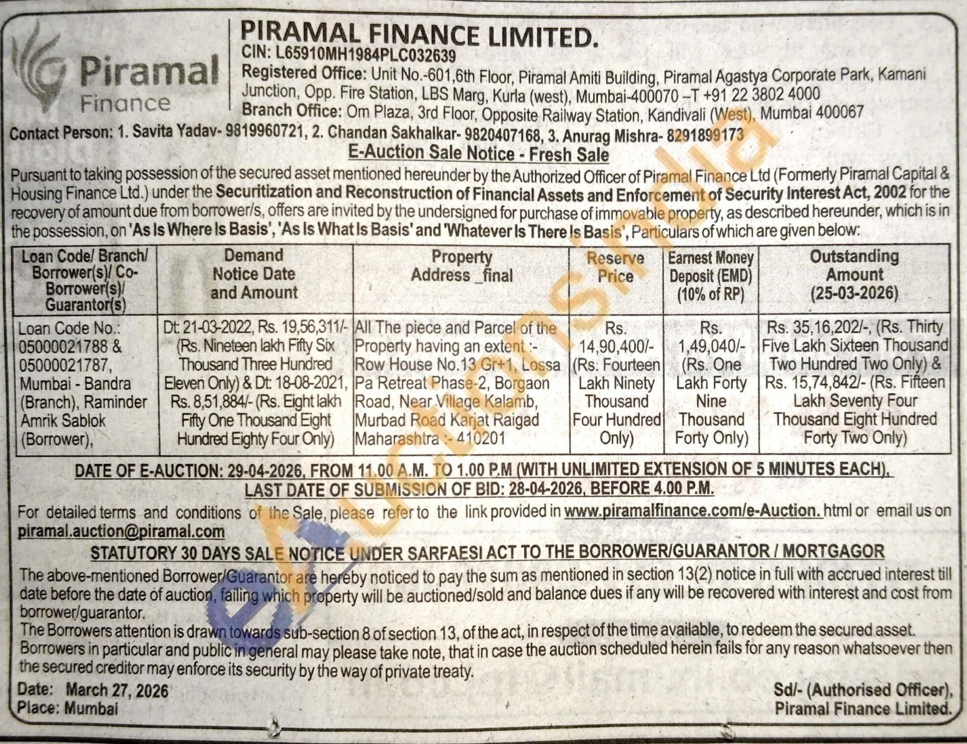 All The piece and Parcel of the Property having an extent :-Row House No. 13 Gr+1, Lossa Pa Retreat Phase-2, Borgaon Road, Near Village Kalamb, Murbad Road Karjat Raigad Maharashtra :- 410201