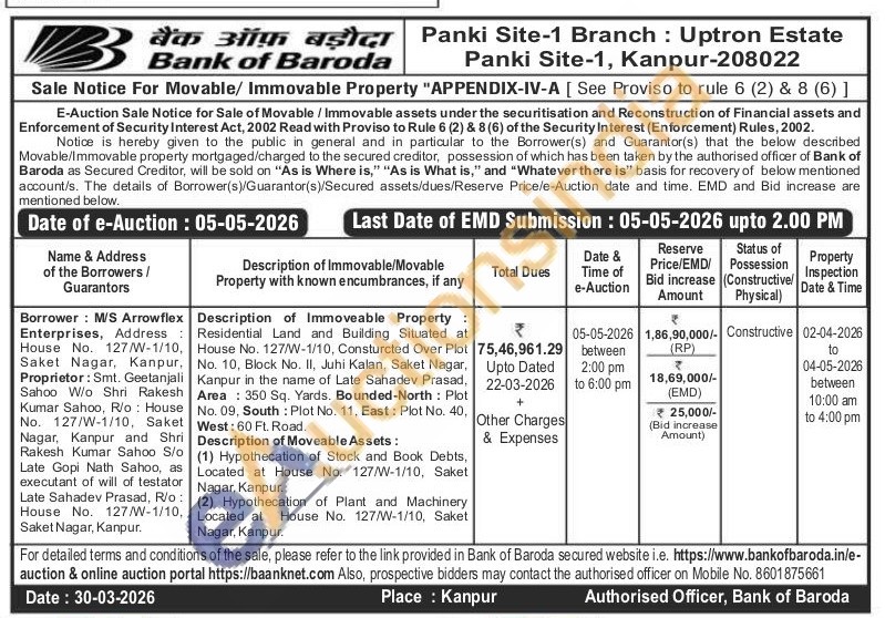 Residential Land and Building Situated at House No. 127/W-1/10, Consturcted Over Plot No. 10, Block No. II, Juhi Kalan, Saket Nagar, Kanpur in the name of Late Sahadev Prasad, Area: 350 Sq. Yards. Bounded-North: Plot No. 09, South: Plot No. 11, East: Plot No. 40, West: 60 Ft. Road. Description of Moveable Assets: (1) Hypothecation of Stock and Book Debts, Located at House No. 127/W-1/10, Saket Nagar, Kanpur. (2) Hypothecation of Plant and Machinery Located at House No. 127/W-1/10, Saket Nagar, Kanpur.