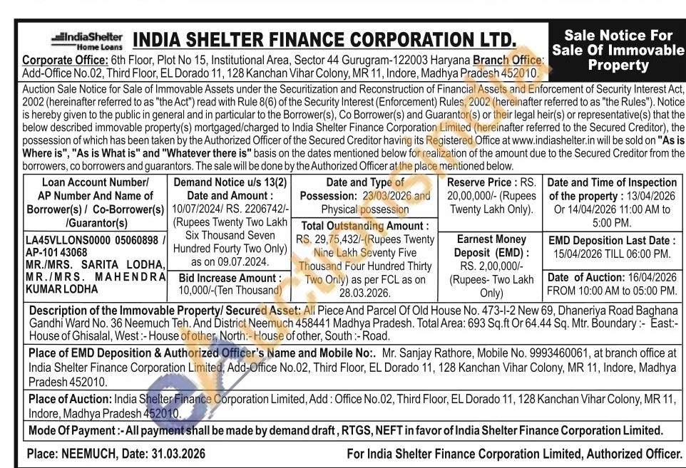 Description of the Immovable Property/Secured Asset: All Piece And Parcel Of Old House No. 473-1-2 New 69, Dhaneriya Road Baghana Gandhi Ward No. 36 Neemuch Teh. And District Neemuch 458441 Madhya Pradesh. Total Area: 693 Sq.ft Or 64.44 Sq. Mtr. Boundary:- East:-House of Ghisalal, West:- House of other, North:- House of other, South :- Road