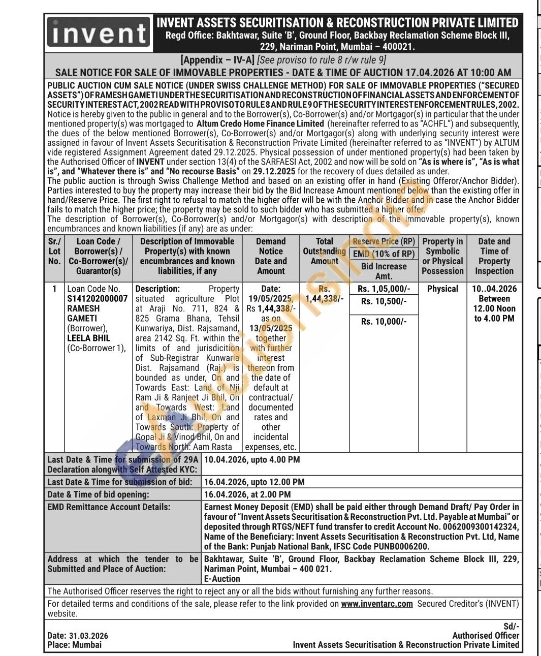 Description: Property situated agriculture Plot at Araji No. 711, 824 & 825 Grama Bhana, Tehsil Kunwariya, Dist. Rajsamand, area 2142 Sq. Ft. within the limits of and jurisdicition of Sub-Registrar Kunwaria Dist. Rajsamand (Raj.) is bounded as under, On and Towards East: Land of Nji Ram Ji & Ranjeet Ji Bhil, On and Towards West: Land of Laxman Ji Bhil, On and Towards South: Property of Gopal Ji & Vinod Bhil, On and Towards North: Aam Rasta