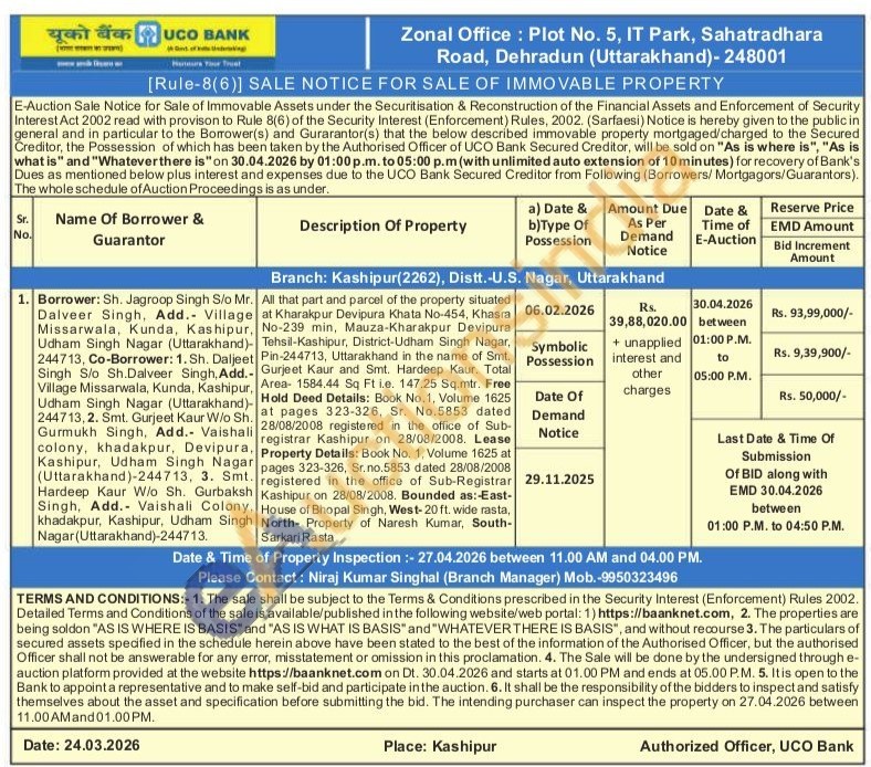 All that part and parcel of the property situated at Kharakpur Devipura Khata No-454, Khasra No-239 min, Mauza-Kharakpur Devipura Tehsil-Kashipur, District-Udham Singh Nagar, Pin-244713, Uttarakhand in the name of Smt. Gurjeet Kaur and Smt. Hardeep Kaur. Total Area- 1584.44 Sq Ft i.e. 147.25 Sq.mtr. Free Hold Deed Details: Book No.1, Volume 1625 at pages 323-326, Sr. No.5853 dated 28/08/2008 registered in the office of Sub-registrar Kashipur on 28/08/2008. Lease. Property Details: Book No. 1, Volume 1625 at pages 323-326, Sr.no.5853 dated 28/08/2008 registered in the office of Sub-Registrar Kashipur on 28/08/2008. Bounded as:-East-House of Bhopal Singh, West-20 ft. wide rasta, North- Property of Naresh Kumar, South-Sarkari Rasta