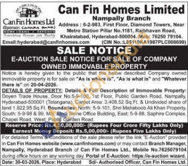 Doyen Trade House, Door No.5-9-100, 1st Floor, Public Garden Road, Nampally, Hyderabad-500001 (Telangana) Carpet Area: 3,408.52 Sq Ft. & Undivided share of land 1,822.95 Sq. FL. Boundaries: North: 5-9-101, Shri Mahaboob Ali Khan Property, South: 5-9-98 & 99, Mis. Modi Stone Office Building, East: 5-9-88, Saphire Complex. Chapel Road, West: Public Garden Road