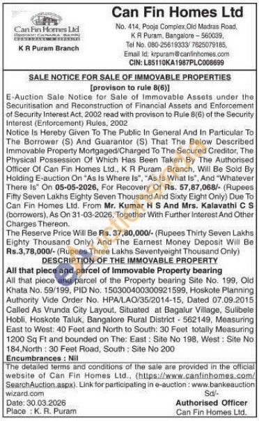 DESCRIPTION OF THE IMMOVABLE PROPERTY : All that piece and parcel of Immovable Property bearing : All that piece and parcel of the Property bearing Site No. 199, Old Khata No. 59/199, PID No. 150300400300921599, Hoskote Planning Authority Vide Order No. HPA/LAO/35/2014-15, Dated 07.09.2015 Called As Vrunda City Layout, Situated at Bagalur Village, Sulibele Hobli, Hoskote Taluk, Bangalore Rural District 562149, Measuring East to West: 40 Feet and North to South: 30 Feet totally Measuring 1200 Sq Ft and bounded on The: East: Site No 198, West: Site No 184, North: 30 Feet Road, South Site No 200