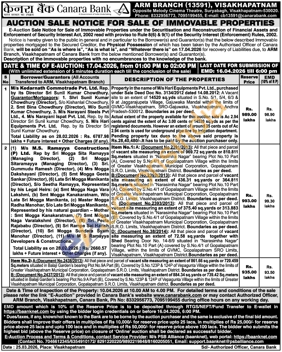 Item No.1: A: (Document No.2391/2013): All that piece and parcel vacant site measuring an extent of 969.72 sq.yards or 810.811 Sq.meters situated in "Narasimha Nagar bearing Plot No.10 Part Greater Visakhapatnam Municipal Corporation, Gopalapatnam S.R.O. Limits, Visakhapatnam District. Boundaries as per deed. :(Document No.2392/2013): All that piece and parcel of vacant site measuring an extent of 436.31 sq.yards or 364.811 Sq.meters situated in "Narasimha Nagar" bearing Plot No.10 Part A), Covered by S.No.4/1 of Gopalapatnam Village within the limits Greater Visakhapatnam Municipal Corporation, Gopalapatnam S.R.O. Limits, Visakhapatnam District. Boundaries as per deed. : (Document No.2393/2013): All that piece and parcel of vacant site measuring an extent of 375.40 sq.yards or 313.883 Sq.meters situated in "Narasimha Nagar" bearing Plot No. 10 Part B), Covered by S.No.4/1 of Gopalapatnam Village within the limits Greater Visakhapatnam Municipal Corporation, Gopalapatnam S.R.O. Limits, Visakhapatnam District. Boundaries as per deed. : (Document No.38/2014): All that piece and parcel of vacant site measuring an extent of 72.58 sq.yards together with (A), Covered by S.No.4/1 of Gopalapatnam Village within the limits Shed Bearing Door No. 14-8/9 situated in "Narasimha Nagar" bearing Plot No.10 Part (A) covered by S.No.4/1 of Gopalapatnam Village, within the limits of GVMC, Gopalapatnam SRO Limits, Visakhapatnam, Visakhapatnam District. Boundaries as per deed