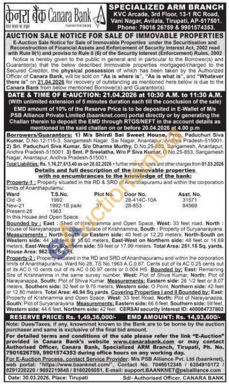 Property-2: Property situated in the RD and SRD of Ananthapuramu and within the corporation limits of Ananthapuramu. Ward No.28, TS No. 1963 A.C.0.87. Cents out of its AC 0.25 cents out of its AC.0.10 cents out of its AC 0.00.97 cents or 0.004 HS. Bounded by: East: Remaining Site of Krishnamma in the same survey number, West: Piot of Shiva Kumar, North: Plot of Narayanappa, South: Plot of Shiva Kumar. Measurements; Eastern side: 26 1/2 feet or 8.07 meters, Southern side: 32 feet or 9.75 meters, Western side: O Point, Northern side: 42 feet or 12.80 meters. Total Area: 46.94 Sq yards. Covering Properties Land II Bounded by: East: Property of Krishnamma and Open Space, West: 33 feet Road, North: Plot of Narayanappa, South: Plot of Suryanarayana. Measurements: Eastern side: 66.6 feet, Southern side: 59 feet, Western side: 44.6 feet, Northern side: 42 feet. CERSAI security Interest ID: 400084737802
