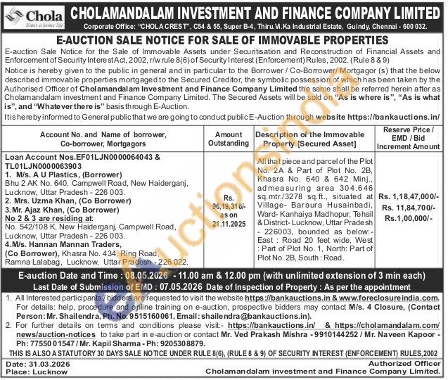 All that piece and parcel of the Plot No. 2A & Part of Plot No. 2B, Khasra No. 640 & 642 Minj... admeasuring area 304.646 sq.mtr./3278 sq.ft., situated at Village Baraura Husainbadi, Ward-Kanhaiya Madhopur, Tehsil & District- Lucknow, Uttar Pradesh 226003, bounded as below:-East Road 20 feet wide, West Part of Plot No. 1, North: Part of Plot No. 2B, South: Road