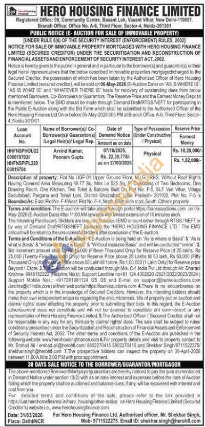 Description of property: Flat No UGF-01 Upper Ground Floor, MIG, RHS, Without Roof Rights Having Covered Area Measuring 48.77 Sq. Mtrs Le 525 84, Ft Consisting of Two Bedrooms. One Drawing Room, One Kitchen, Two Toilet & Balcony Built On Plot No F-5, SLF Ved Vihar, Village Sadullabad, Pargana and Tehsil Loni, District Ghaziabad, Uttar Pradesh- 201102, Plot No. F-5 is Bounded As: East Plot No F-6West: Plot No. F-4, North: 9 Mtr wide road, South: Other's property