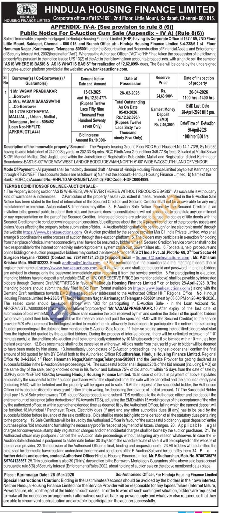 Description of the Immovable property/Secured: The Property bearing Ground Floor RCC Roof House H.No. 14-1-73/B, Sy No.989 having its area total extent of 242.00 Sq.yards. or 202.33 Sq.mtrs. RCC Plinth Area Ground floor 346.77 Sq feets. Situated at Mallial Shivar & GP, Mandal Mallial, Dist: Jagtial, and within the Jurisdiction of Registration Sub-district Mallial and Registration district Karimnagar, Boundaries:-EAST: 6'-00" WIDE WAY, WEST: LAND OF BODDU DEVAIAH, NORTH: 6'-00" WIDE WAY, SOUTH: LAND OF VENDOR