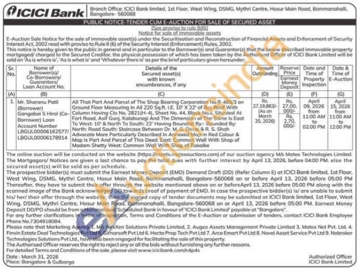 All That Part And Parcel of The Shop Bearing Corporation No.8-483/3 on Ground Floor Measuring In All 220 Sq.ft. I.E. 10' X 22 of Rice Roof With Column Having Cts No. 2821(H-4), Sheet No. 44, Block No.ii, Situated At Fort Road, Asif Gunj, Kalaburagi And The Dimension of The Same Is East To West: 10 & North To South: 22' Having Bounded By:- Bounded By: North: Road South: Staircase Between Dr. M. G. Desai & R. 5. Shah Advocate More Particularly Described in Annexed Map In Red Colour & Map Is Part And Parcel of This Deed. East: Common Wall With Shop of Madam Shetty West: Common Wall With Shop of Rasalke