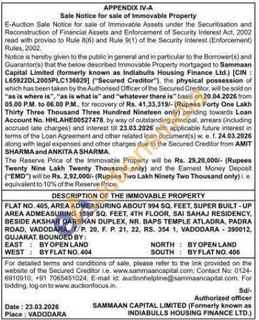 DESCRIPTION OF THE IMMOVABLE PROPERTY : FLAT NO. 405, AREA ADMEASURING ABOUT 994 SQ. FEET, SUPER BUILT-UP AREA ADMEASURING 1590 SQ. FEET, 4TH FLOOR, SAI SAHAJ RESIDENCY. BESIDE AKSHAR DARSHAN DUPLEX, NR. BAPS TEMPLE ATLADRA, PADRA ROAD, VADODARA, T. P. 20, F. P. 21, 22, RS. 354 1, VADODARA 390012, GUJARAT. BOUNDED BY:
