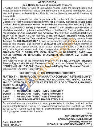 DESCRIPTION OF THE IMMOVABLE PROPERTY : FLAT NO. T-1, THIRD FLOOR, "PANCHRATNA COMPLEX", REVENUE SURVEY NO. 337 AND SANAD NO. 70, CS WARD NO. 8/1, CS NO. 1997, TPS NO. 5, FP NO. 194, SITUATED ON PLOT NO. 78 AT STREET NO. 2 OF GITANAGAR, RAJKOT-360002, GUJARAT.