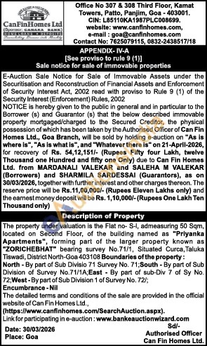 The property under valuation is the Flat no- S-I, admeasuring 50 Sqm, located on Second Floor, of the building named as "Priyanka Apartments", forming part of the larger property known as "ZORICHEBHAT" bearing survey No.71/1, Situated Curca, Taluka Tiswadi, District North-Goa 403108 Boundaries of the property: North-By part of Sub Divisio 71 Survey No. 71; South - By part of Sub Division of Survey No.71/1A; East By part of sub-Div 7 of Sy No. 72; West-By part of Sub Division 1 of Survey No. 72/;