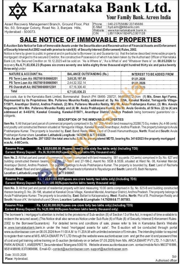 Item No. 1: All that part and parcel of commercial property comprised in Sy. No. 209-A6 with land measuring 20288.73 Sq. meters (Ac.4-98 cents) and poultry unit constructed thereon situated at Yerragunta Village, Kanekal Mandal, Ananthapur, Andhra Pradesh. The property belongs to Avula Prabhanjana Kumar. The property is bounded by, East: Bandi Rasta, West: Land of Chavati Hanumanthappa, North: Road and South: Avula Prabhanjan Kumar share. Location: Latitude & Longitude: 14.839836 & 77.003226.