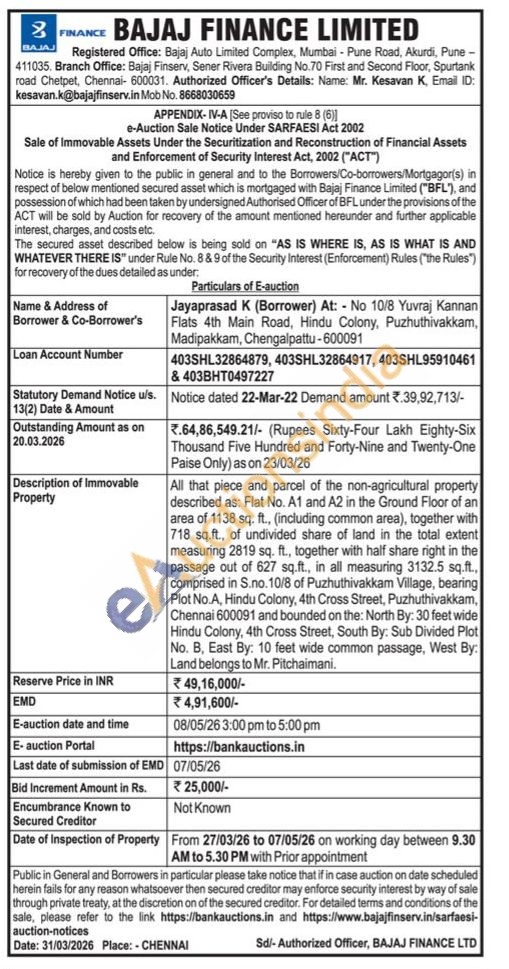 All that piece and parcel of the non-agricultural property described as: Flat No. A1 and A2 in the Ground Floor of an area of 1138 sq. ft., (including common area), together with 718 sq.ft., of undivided share of land in the total extent measuring 2819 sq. ft., together with half share right in the passage out of 627 sq.ft., in all measuring 3132.5 sq.ft., comprised in S.no.10/8 of Puzhuthivakkam Village, bearing Plot No.A, Hindu Colony, 4th Cross Street, Puzhuthivakkam, Chennai 600091 and bounded on the: North By: 30 feet wide Hindu Colony, 4th Cross Street, South By: Sub Divided Plot No. B, East By: 10 feet wide common passage, West By: Land belongs to Mr. Pitchaimani.