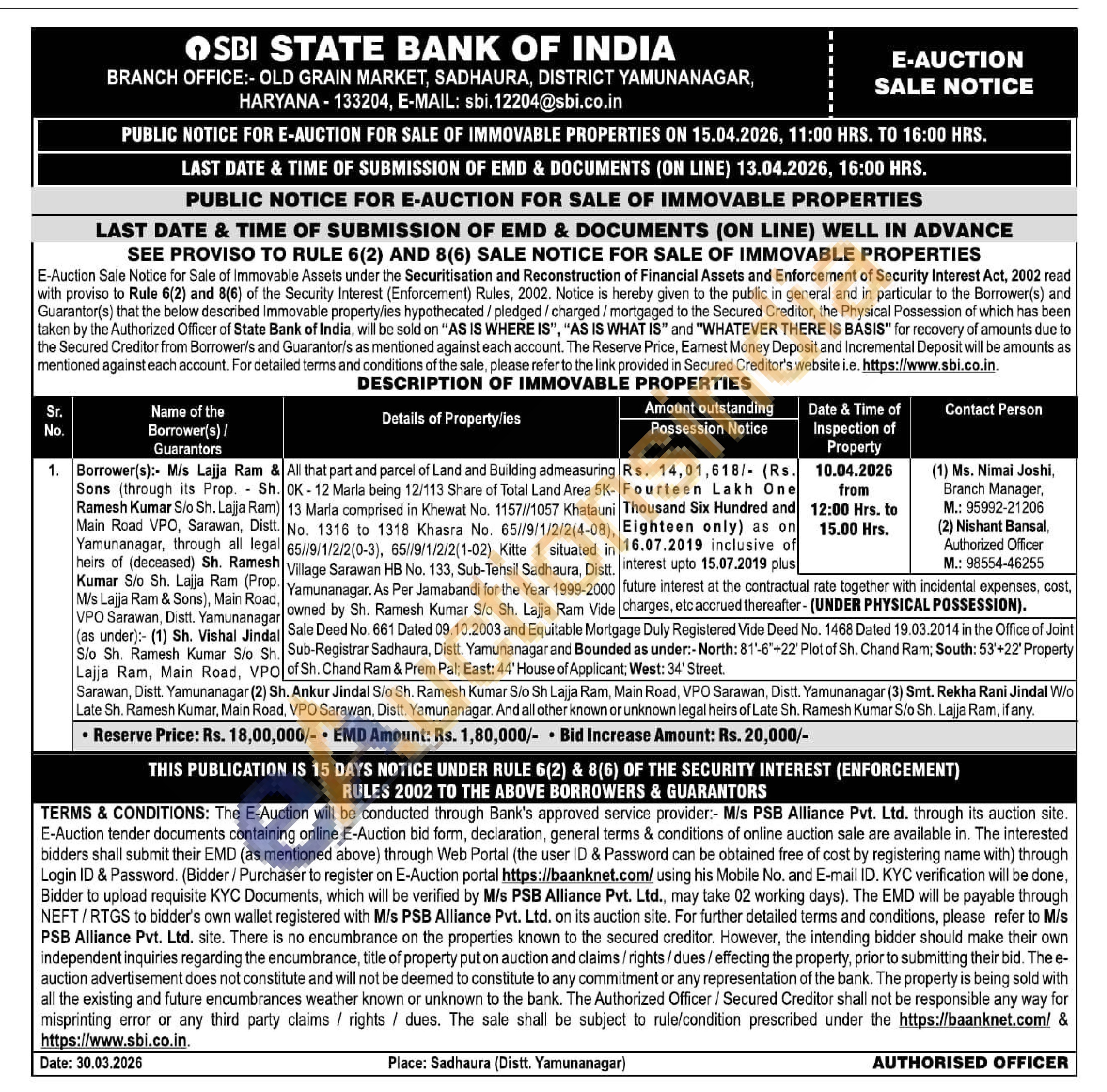 All that part and parcel of Land and Building admeasuring OK-12 Marla being 12/113 Share of Total Land Area 5K-13 Marla comprised in Khewat No. 1157//1057 Khatauni No. 1316 to 1318 Khasra No. 65//9/1/2/2(4-08),65//9/1/2/2(0-3), 65/9/1/2/2(1-02) Kitte 1 situated in Village Sarawan HB No. 133, Sub-Tehsil Sadhaura, Distt Yamunanagar. As Per Jamabandi for the Year 1999-2000 owned by Sh. Ramesh Kumar S/o Sh. Lajja Ram Vide Sale Deed No. 661 Dated 09.10.2003 and Equitable Mortgage Duly Registered Vide Deed No. 1468 Dated 19.03.2014 in the Office of Joint Sub-Registrar Sadhaura, Distt. Yamunanagar and Bounded as under:-North: 81'-6"+22' Plot of Sh. Chand Ram; South: 53'+22' Property of Sh. Chand Ram & Prem Pal; East: 44' House of Applicant; West: 34' Street