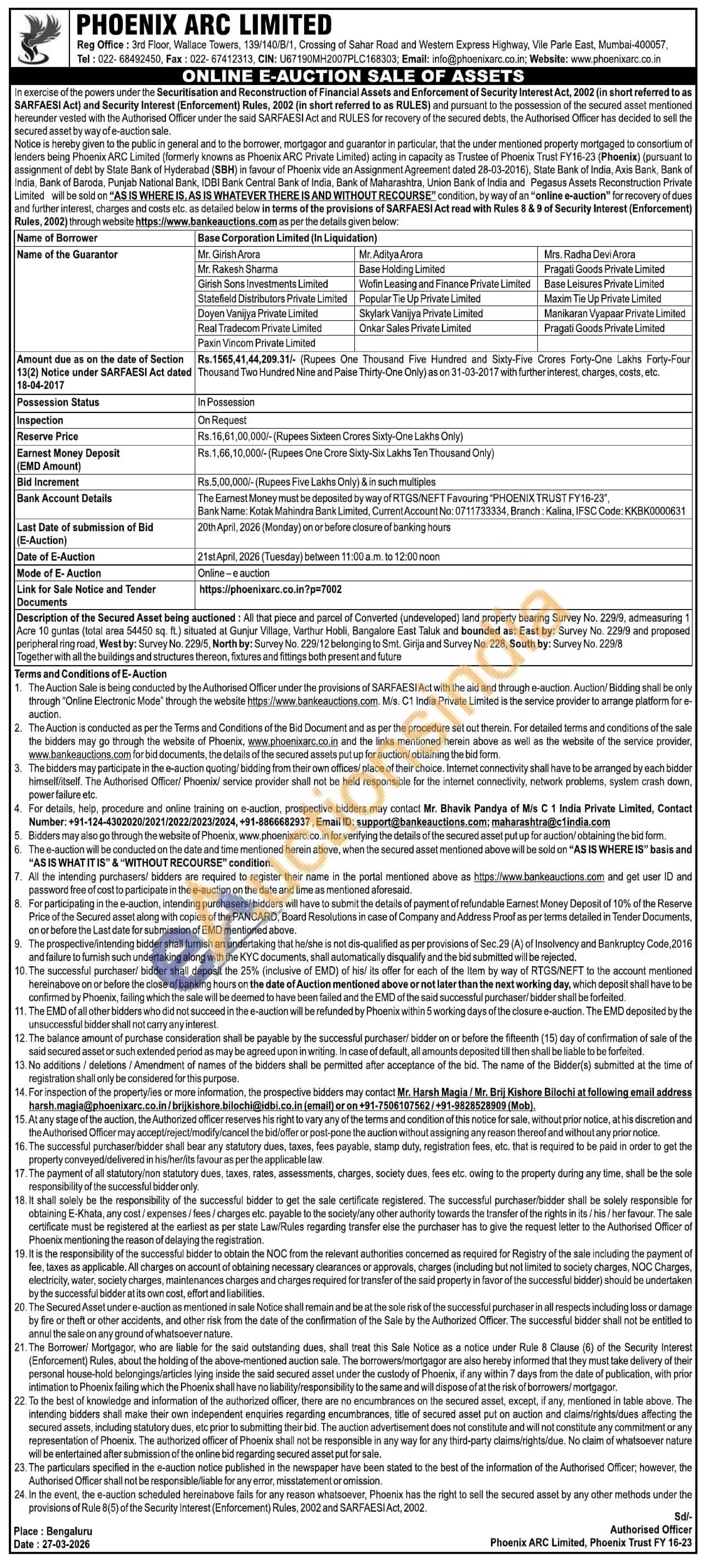 Description of the Secured Asset being auctioned: All that piece and parcel of Converted (undeveloped) land property bearing Survey No. 229/9, acmeasuring 1 Acre 10 guntas (total area 54450 sq. ft.) situated at Gunjur Village, Varthur Hobli, Bangalore East Taluk and bounded as: East by: Survey No. 229/9 and proposed peripheral ring road, West by: Survey No. 229/5, North by: Survey No. 229/12 belonging to Smt. Girija and Survey No. 228. South by: Survey No. 229/8 Together with all the buildings and structures thereon, fixtures and fittings both present and future