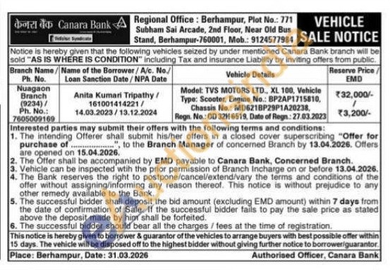 Model: TVS MOTORS LTD., XL 100, Vehicle Type: Scooter, Engine No.: BP2AP1715810, Chassis No.: MD6218P29P1A20238, Rogn. No.: OD 32H 6519, Date of Regn: 27.03.2023