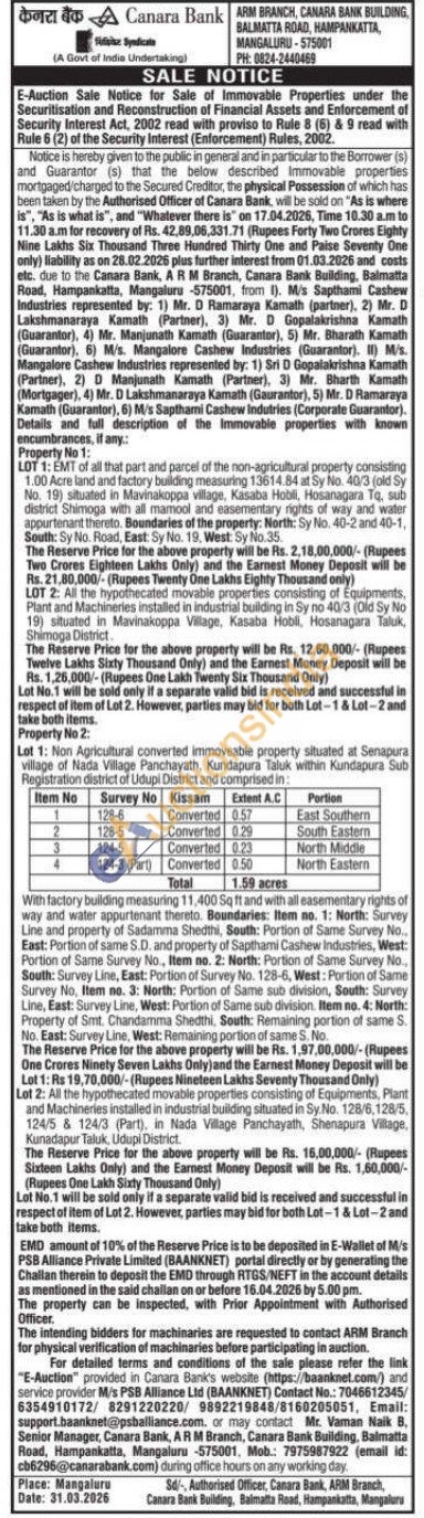 Lot 2: All the hypothecated movable properties consisting of Equipments, Plant and Machineries installed in industrial building situated in Sy.No. 128/6,128/5, 124/5 & 124/3 (Part), in Nada Village Panchayath, Shenapura Village, Kunadapur Taluk, Udupi District