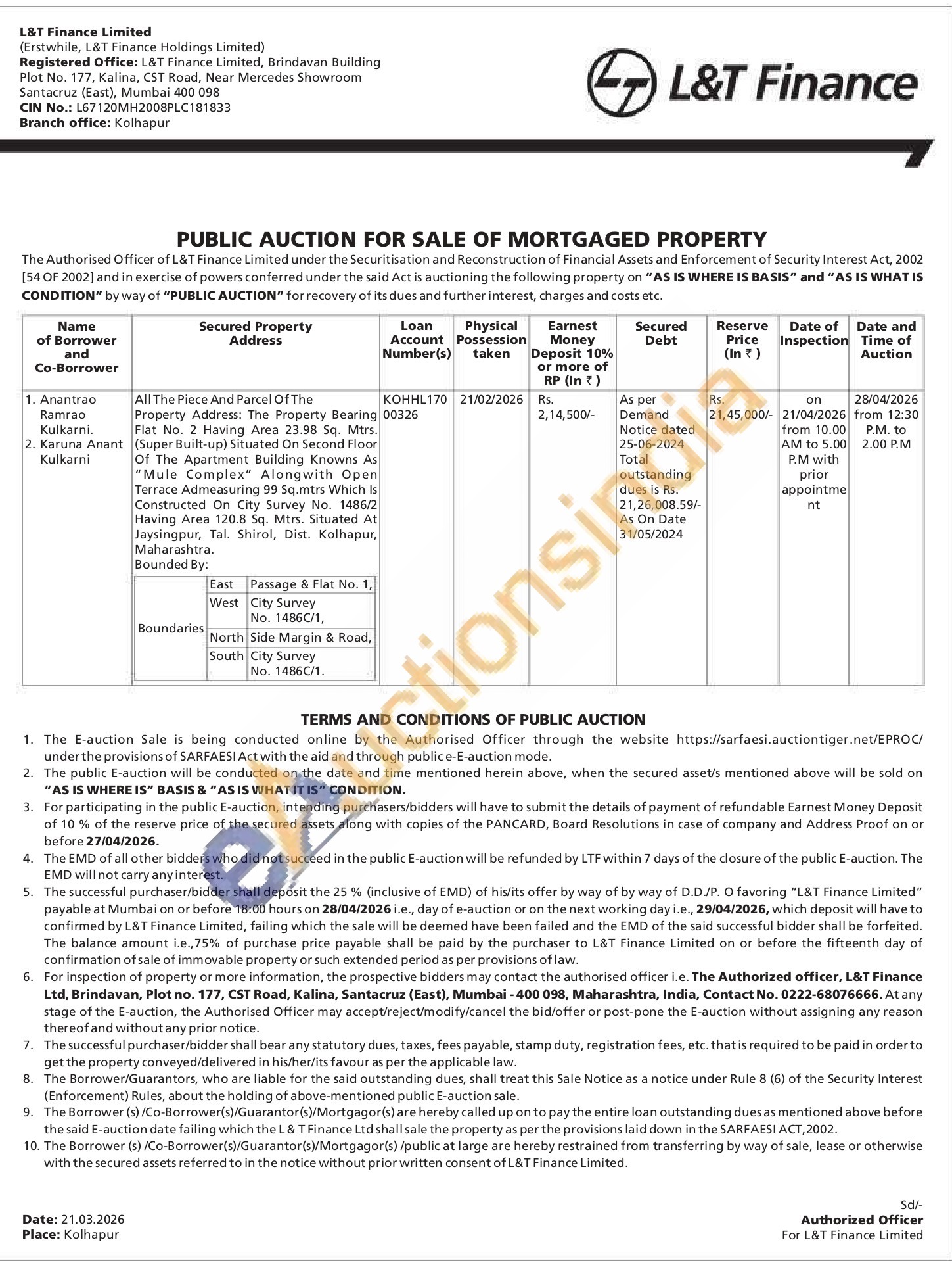 All The Piece And Parcel Of The Property Address: The Property Bearing Flat No. 2 Having Area 23.98 Sq. Mtrs. (Super Built-up) Situated On Second Floor Of The Apartment Building Knowns As "Mule Complex Alongwith Open Terrace Admeasuring 99 Sq.mtrs Which Is Constructed On City Survey No. 1486/2 Having Area 120.8 Sq. Mtrs. Situated At Jaysingpur, Tal. Shirol, Dist. Kolhapur, Maharashtra. Bounded By:East Passage & Flat No. 1, West City Survey Boundaries. No. 1486C/1, North Side Margin & Road, South City Survey No. 1486C/1