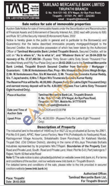 The industrial land to the extent of 14645 sq.ft or 1627.22 sq, yd situated at Survey No 296/1, Plot No S-8 (part), APIIC, Near Lanco Factory, Near P.N. (Puthalapattu to Naidupeta) Road. Rachagunneri Village Accounts, Srikalahasthi Gram Panchayat, Sri Kalahasti Mandal, Tirupati Dist. (Old Chittoor District), standing in the name of Mis. Jaya Thirumala Biofuels Industries represented by its proprietrix Mrs. T.Rajani. Boundaries of the Property East: Road and Private Land, South: Road and Private Land, West: Plot No S-8 (Part) belongs to T Rajani, North: 60 feet wide Road