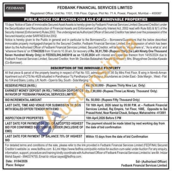 All that piece & parcel of the property bearing in respect of Flat No 103, admeasuring 81.95 Sq Mtrs First Floor, B wing in Nirmiti-Aman Apartment out of CTS No 4629 situatled in Pandharpur To Pandharpur Dist Solapur. Boundaries as Under East:- Side Margin, West-Flat No 104 and Stairs. Lobby, Lift, North-Open to Sky, South-Side Marging