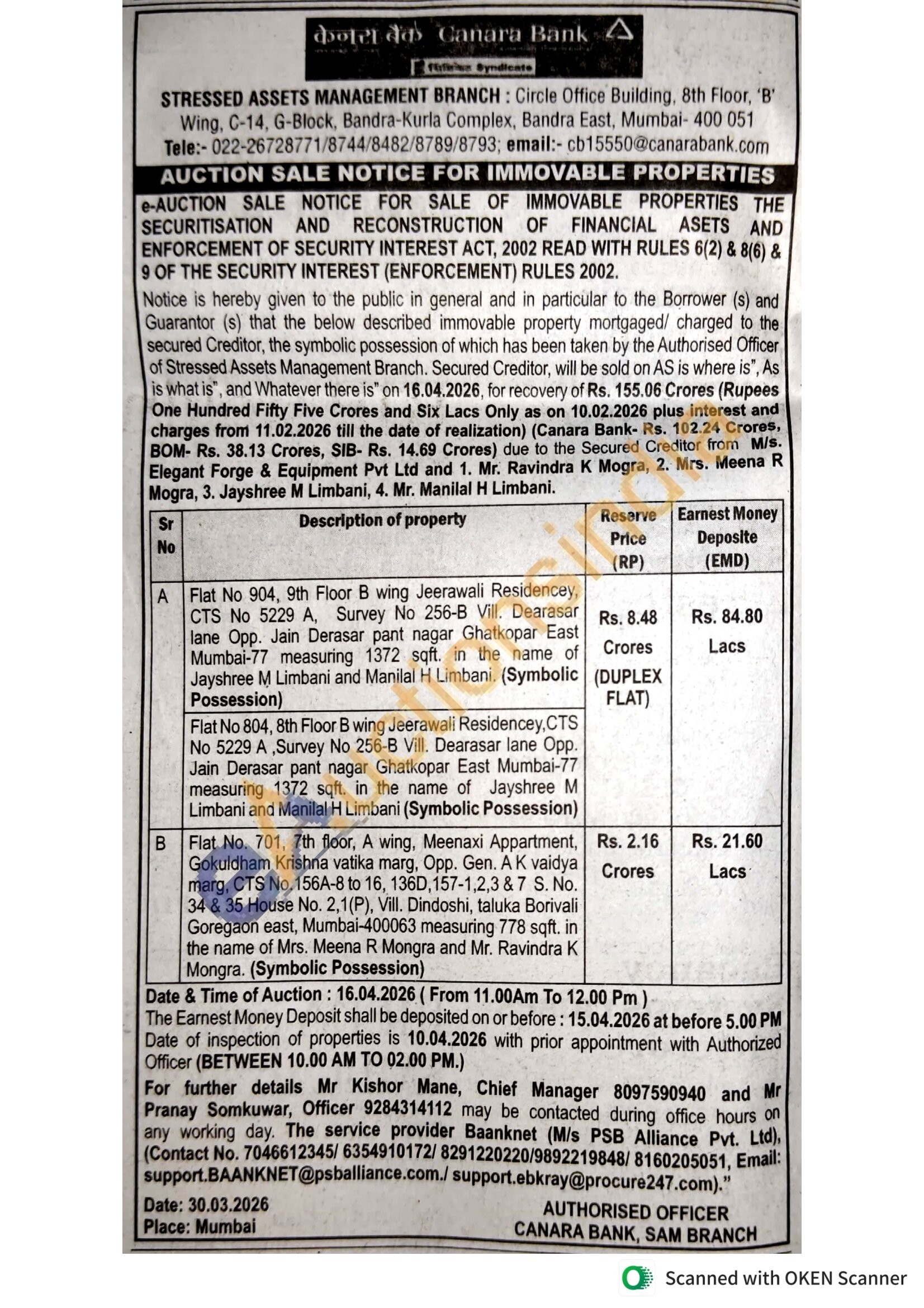 Flat No. 701, 7th floor, A wing, Meenaxi Appartment, Gokuldham Krishna vatika marg, Opp. Gen. AK vaidya marg, CTS No.156A-8 to 16, 136D, 157-1,2,3 & 7 S. No. 34 & 35 House No. 2,1(P), Vill. Dindoshi, taluka Borivali Goregaon east, Mumbai-400063 measuring 778 sqft. in the name of Mrs. Meena R Mongra and Mr. Ravindra K Mongra. (Symbolic Possession)