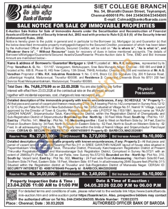Al that piece and parcel of vacant land of house site bearing Plot No.311 in SREE GAYATHRI NAGAR layout of house sites situated in Papambakkam Village, Truvallur Taluk, Thiruvallur District, Previously Kancheepuram Registration District at Present Thiruvallur Registration District and Manavalanagar Sub Registration District, Comprised in Survey No.572/1 with an extent of 2646Sq Ft (Patta No.728 as per Patta, new Survey No.572/10) Bounded on the North by: Plot No. 310, South by: Vacant land, East by: Plot No. 302, West by: 24 Feet wide Road Admeasuring: Northern Side:60 Feet, Southern Side:74 Feet, Eastern Side: 18 Feet, Western Side: 61 Feet. In all admeasuring 2646 Square feet (Plot No 311) Situated within the Registration district at Tiruvallur and Sub-Registration District of Manavala Nagar. CERSAI ID: SECURITY INTEREST ID: 400074788449 Property Id: BARBCOLMAD2026002