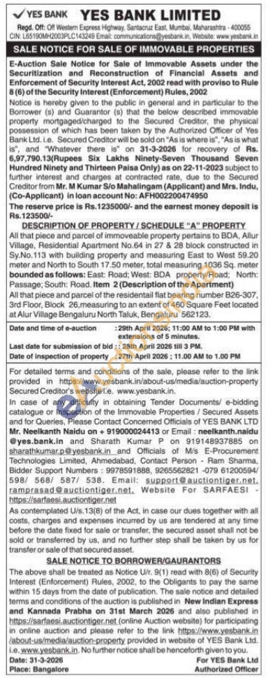 DESCRIPTION OF PROPERTY/SCHEDULE "A" PROPERTY : All that piece and parcel of immoveable property pertains to BDA, Allur Village, Residential Apartment No.64 in 27 & 28 block constructed in Sy.No.113 with building property and measuring East to West 59.20 meter and North to South 17.50 meter, total measuring 1036 Sq. meter bounded as follows: East: Road: West: BDA property/Road; North: Passage; South: Road. Item 2 (Description of the Apartment) All that piece and parcel of the residentail flat bearing number B26-307, 3rd Floor, Block 26,measuring to an extent of 460 Square Feet located at Alur Village Bengaluru North Taluk, Bengaluru 562123