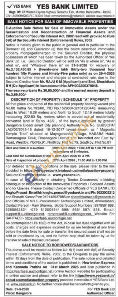 DESCRIPTION OF PROPERTY/SCHEDULE "A" PROPERTY : All that piece and parcel of the residential property bearing vacant plot No.80 Katha No.793/80, PID No.152900402101220448, measuring East to West 18.28 meters and North to South 12.19 meters totally measuring 222.83 Sq. meters which is carved out of residentially converted land in Sy.no. 43/9, of the layout approved by greater Bangalore Bidadi smart City planning Authority vide No. GBBSCPA/LAO/02/2015-16 dated: 15-12-2017 layout known as Magnolia Temple Tree" situated at Mayaganahalli Village, KASABA Hobli, Ramanagara Taluk, Rmanagara District and bounded on: East by: Road, West by: Plot No.91, North by: Plot No.79, South by: Plot No.81