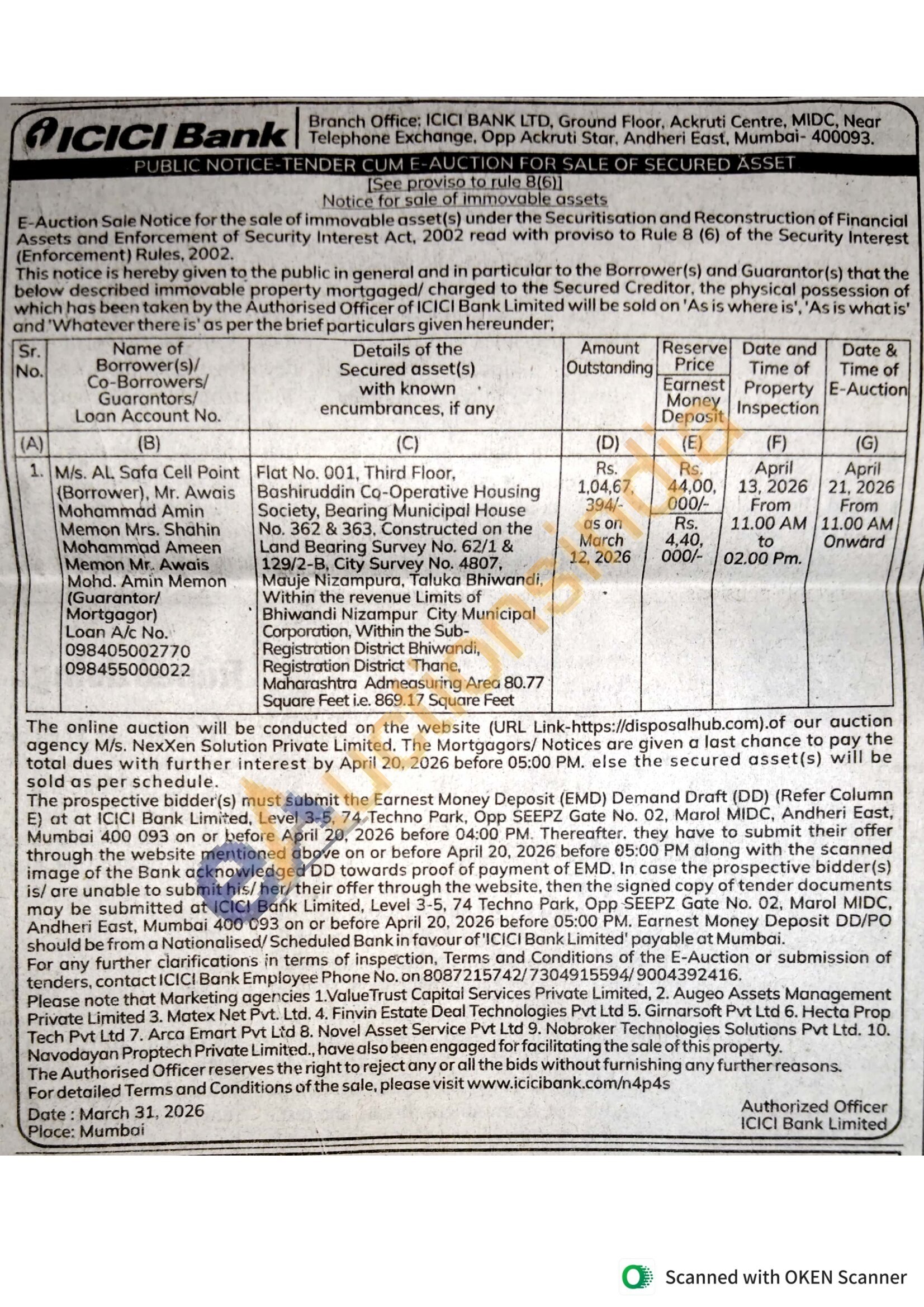 Flat No. 001, Third Floor. Bashiruddin Co-Operative Housing Society, Bearing Municipal House No. 362 & 363, Constructed on the Land Bearing Survey No. 62/1 & 129/2-B, City Survey No. 4807. Mauje Nizampura, Taluka Bhiwandi, Within the revenue Limits of Bhiwandi Nizampur City Municipal Corporation, Within the Sub-Registration District Bhiwandi, Registration District Thane, Maharashtra Admeasuring Area 80.77 Square Feet i.e. 869.17 Square Feet