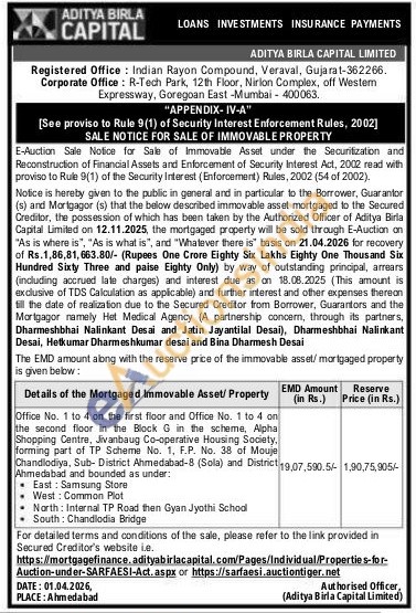 Details of the Mortgaged immovable Asset/Property : Office No. 1 to 4 on the first floor and Office No. 1 to 4 on the second floor in the Block G in the scheme, Alpha Shopping Centre, Jivanbaug Co-operative Housing Society, forming part of TP Scheme No. 1, F.P. No. 38 of Mouje Chandlodiya, Sub-District Ahmedabad-8 (Sola) and District Ahmedabad and bounded as under: