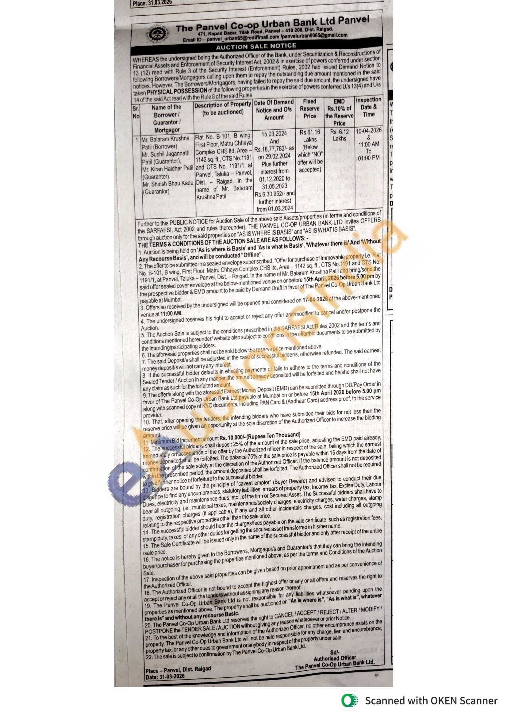 Flat No. B-101, 8 wing. First Floor, Matru Chhaya Complex CHS Itd. Area 1142 sq. ft. CTS No. 1191 . and CTS No. 1191/1, at Pamvel Taluka-Panvel,Dist. Raigad In the name of Mr. Balaram Krushna Patil