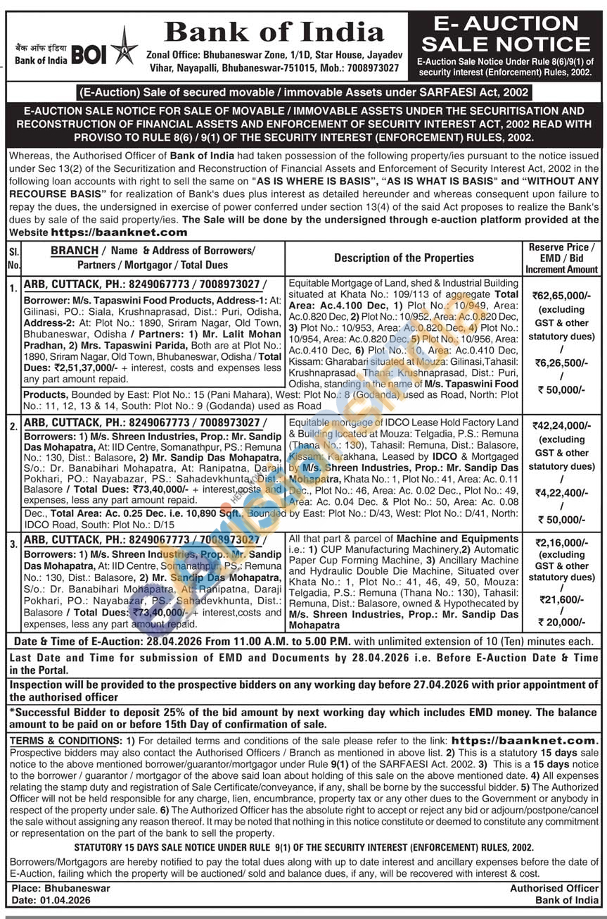 Equitable Mortgage of Land, shed & Industrial Building situated at Khata No.: 109/113 of aggregate Total Area: Ac.4.100 Dec, 1) Plot No.: 10/949, Area: Ac.0.820 Dec, 2) Plot No.: 10/952, Area: Ac.0.820 Dec, 3) Plot No.: 10/953, Area: Ad:0.820 Dec. 4) Plot No.: 10/954, Area: Ac.0.820 Dec, 5) Plot No.: 10/956, Area: Ac.0.410 Dec, 6) Plot No.: 10. Area: Ac.0.410 Dec, Kissam: Gharabari situated at Mouza: Gilinasi, Tahasil: Krushnaprasad, Thana: Krushnaprasad, Dist.: Puri, Odisha, standing in the name of M/s. Tapaswini Food