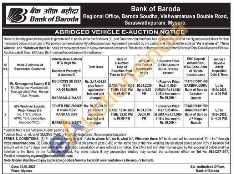 Bank of Baroda Car Auction in Hunsur, Mysuru