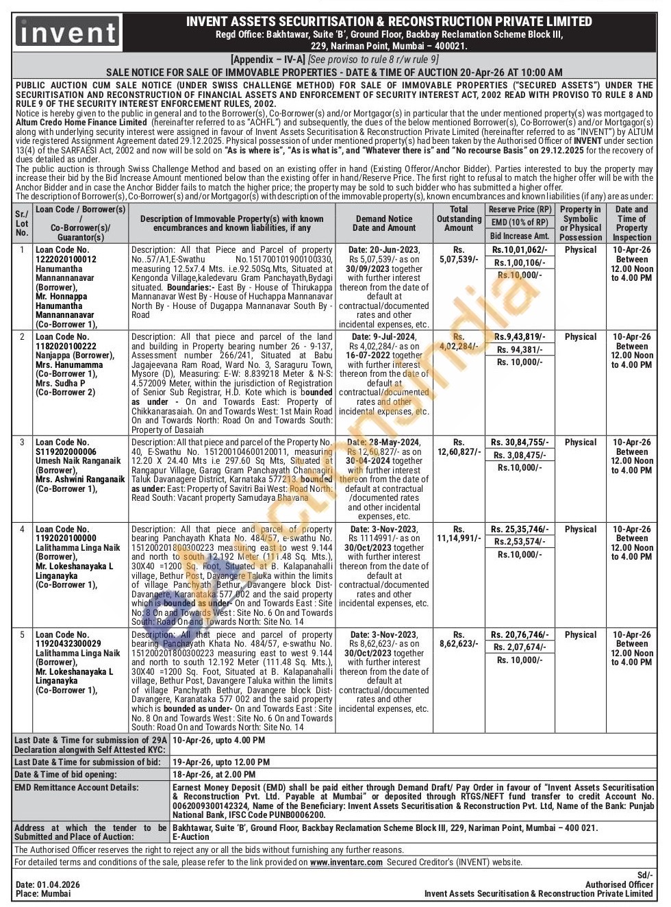 5 Description: All that piece and parcel of property bearing Panchayath Khata No. 484/57, e-swathu No. 151200201800300223 measuring east to west 9.144 and north to south 12.192 Meter (111.48 Sq. Mts.), 30X40 1200 Sq. Foot, Situated at B. Kalapanahalli village, Bethur Post, Davangere Taluka within the limits of village Panchyath Bethur, Davangere block Dist Davangere, Karanataka 577 002 and the said property which is bounded as under- On and Towards East: Site No. 8 On and Towards West: Site No. 6 On and T Towards South: Road On and Towards North: Site No. 14