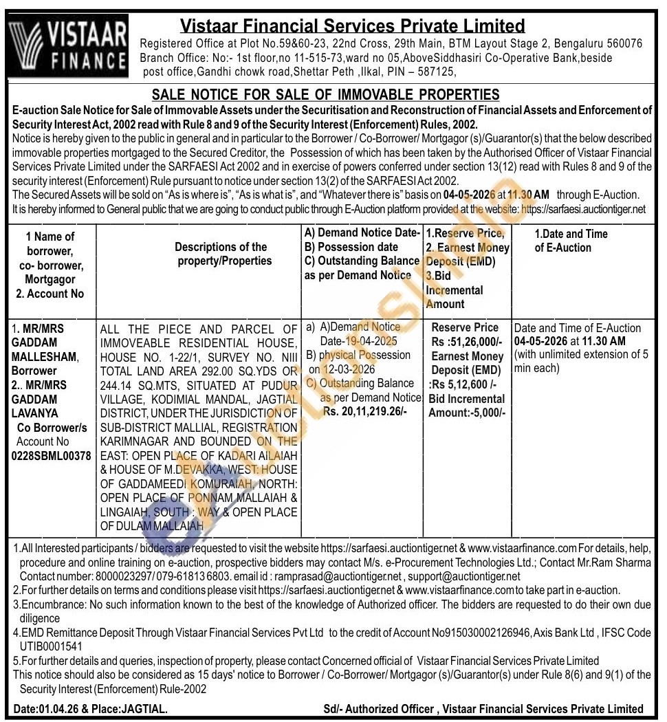 ALL THE PIECE AND PARCEL OF IMMOVEABLE RESIDENTIAL HOUSE, HOUSE NO. 1-22/1, SURVEY NO. NIII TOTAL LAND AREA 292.00 SQ.YDS OR 244.14 SQ.MTS, SITUATED AT PUDUR VILLAGE, KODIMIAL MANDAL, JAGTIAL DISTRICT, UNDER THE JURISDICTION OF SUB-DISTRICT MALLIAL, REGISTRATION KARIMNAGAR AND BOUNDED ON THE EAST: OPEN PLACE OF KADARI AILAIAH & HOUSE OF M.DEVAKKA, WEST: HOUSE OF GADDAMEEDI KOMURAIAH, NORTH: OPEN PLACE OF PONNAM MALLAIAH & LINGAIAH, SOUTH: WAY & OPEN PLACE OF DULAM MALLAIAH