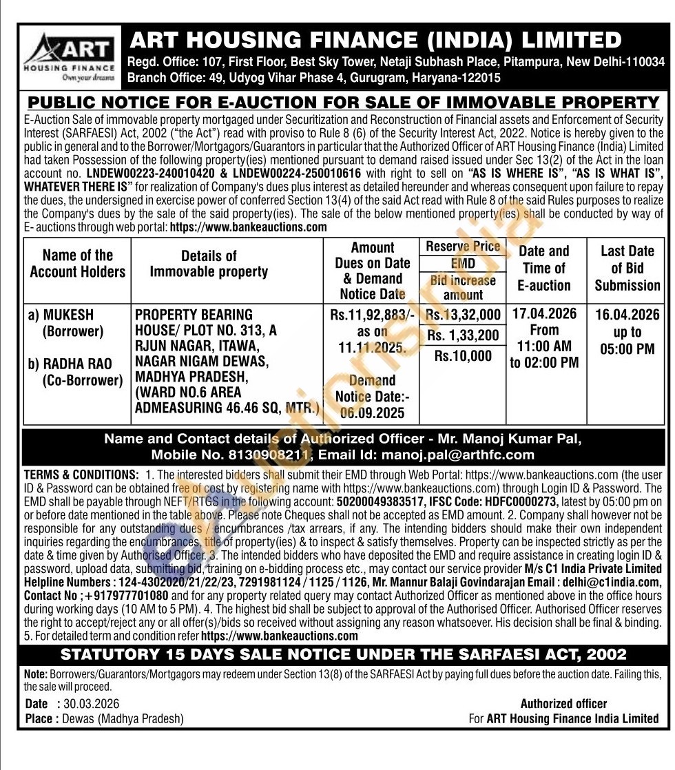 Mr. Manoj Kumar Pal, Mobile No. 8130908211, Email Id: manoj.pal@arthfc.com
