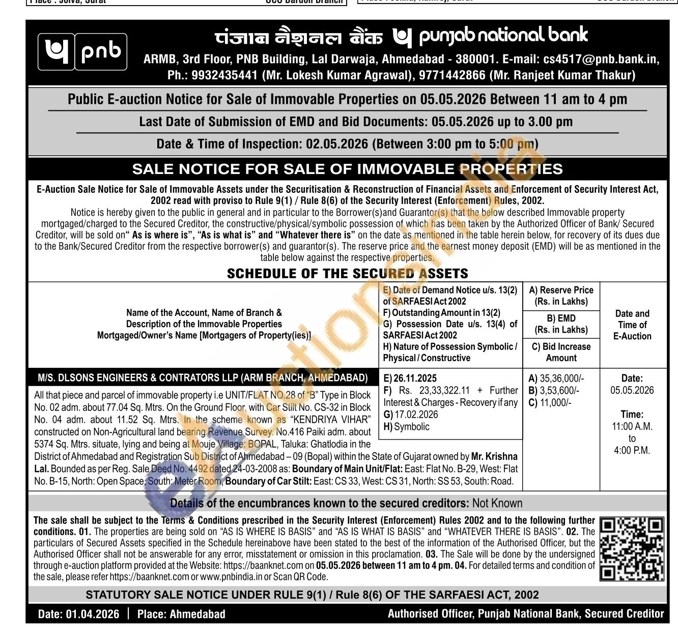 All that piece and parcel of immovable property i.e UNIT/FLAT NO.28 of "B" Type in Block No. 02 adm. about 77.04 Sq. Mtrs. On the Ground Floor, with Car Stilt No. CS-32 in Block No. 04 adm. about 11.52 Sq. Mtrs. In the scheme known as "KENDRIYA VIHAR" constructed on Non-Agricultural land bearing Revenue Survey. No.416 Paiki adm. about 5374 Sq. Mtrs. situate, lying and being at Mouje Village: BOPAL, Taluka: Ghatlodia in the District of Ahmedabad and Registration Sub District of Ahmedabad-09 (Bopal) within the State of Gujarat owned by Mr. Krishna Lal. Bounded as per Reg. Sale Deed No. 4492 dated 24-03-2008 as: Boundary of Main Unit/Flat: East: Flat No. B-29, West: Flat No. B-15, North: Open Space, South: Meter Room, Boundary of Car Stilt: East: CS 33, West: CS 31, North: SS 53, South: Road