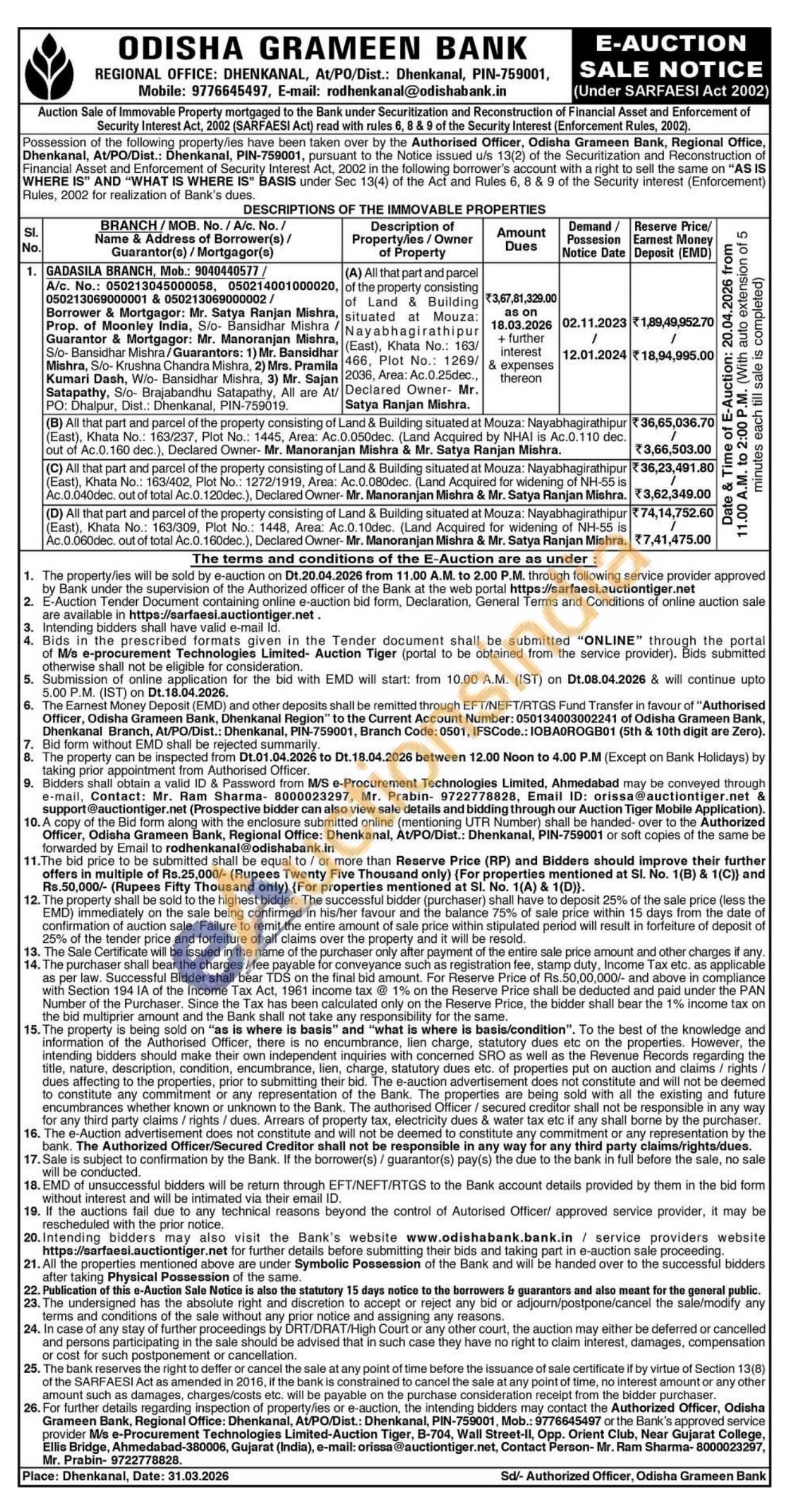 All that part and parcel of Land & Building situated at Mouza: Nayabhagirathipur (East), Khata No.: 163/466, Plot No.: 1269/2036, Area: Ac.0.25dec., Declared Owner- Mr. Satya Ranjan Mishra.