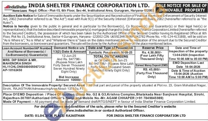 All that part and parcel of the property situated at Plot no. 23, Gram Mohabbat Nagar, Sirahi, RAJASTHAN Admeasuring Area About-1375 Sq. Ft.