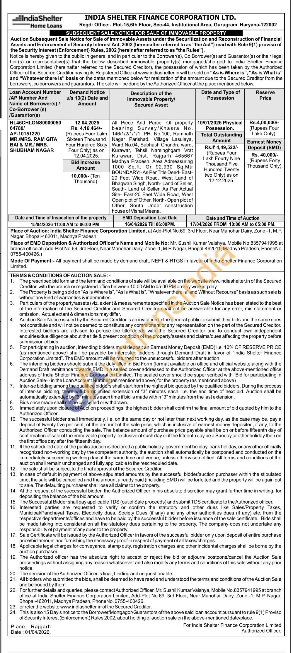 All Piece And Parciel Of property bearing Survey/Khasra No. 146/1/2/1/1/1, PH. No.100, Ramnath Nagar Parishad, Village Lasulaya, Ward No.04, Subhash Chandra ward, Kurawar, Tehsil Narsinghgarh Vrst Kurawar. Dist. Rajgarh 465667 Madhya Pradesh. Area Admeasuring 1000 Sq.ft. Or 92.930 Sq.Mtr BOUNDARY As Per Title Deed East-20 Feet Wide Road. West Land of Bhagwan Singh, North Land of Seller. South- Land of Seller As Per Act Site-East-20 Feet Wide Road, West Open plot of Other North-Open plot of Other, South Under construction me of Vishal Meena