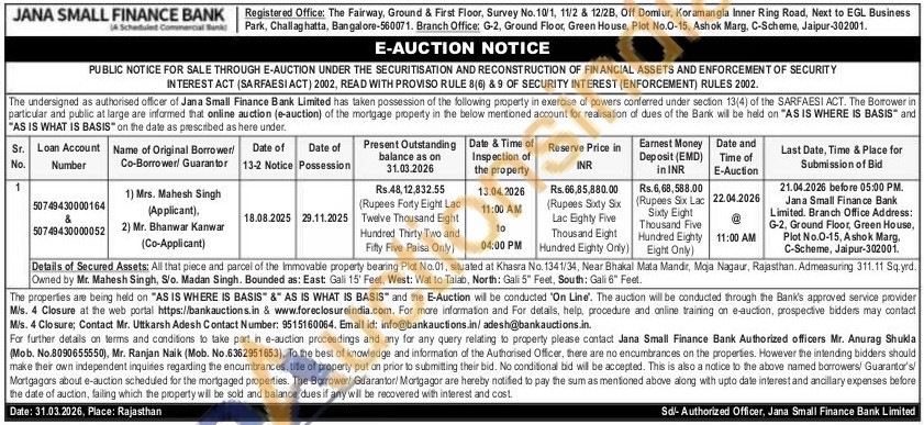 Details of Secured Assets: All that piece and parcel of the Immovable property bearing Plot No.01, situated at Khasra No. 1341/34, Near Bhakal Mata Mandir, Moja Nagaur, Rajasthan. Admeasuring 311.11 Sq.yrd. Owned by Mr. Mahesh Singh, S/o. Madan Singh. Bounded as: East Gali 15' Feet, West: Wat to Talab, North: Gali 5" Feet, South: Gali 6" Feet